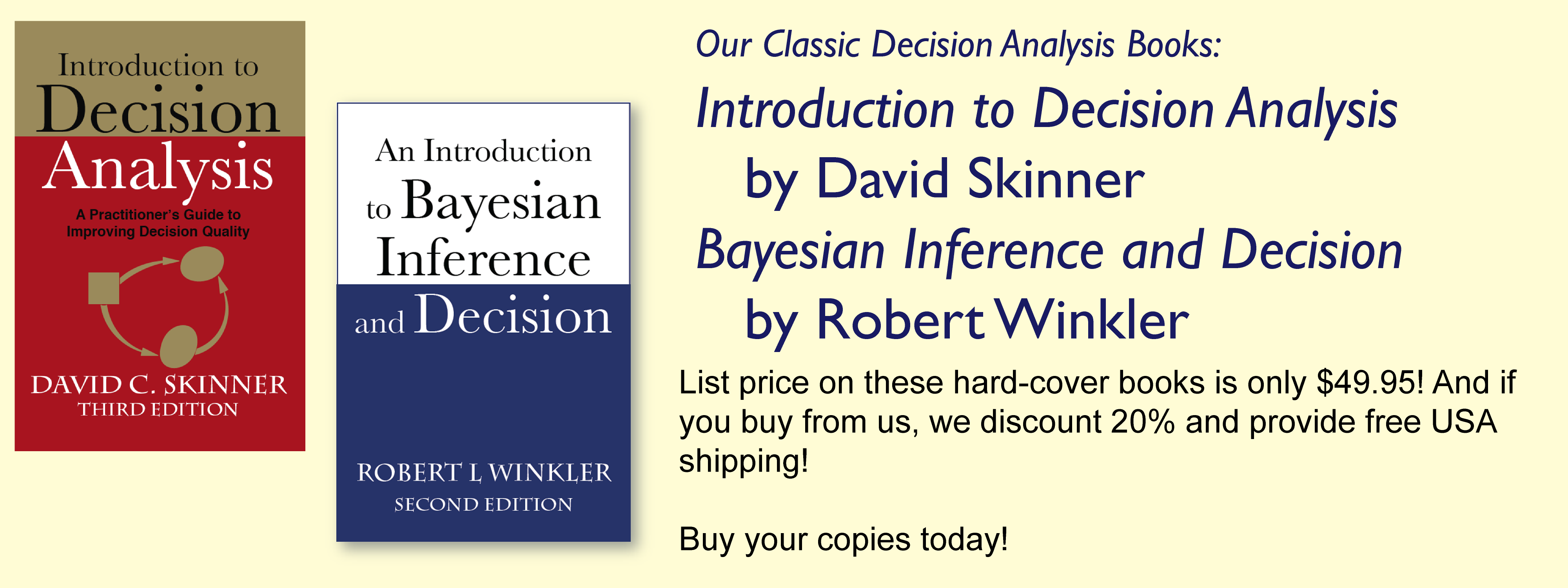 Update 10/01/2025: David Skinner's classic, Introduction to Decision Analysis 3rd Edition on sale for 20%d off and FREE USA Shipping. We printed this book using offset (high quality, but large quantity) and we have too many of them. Link to PayPal checkout for USA orders. List Price is $49.95; sale price $40! For international orders, we use eBay (click here).